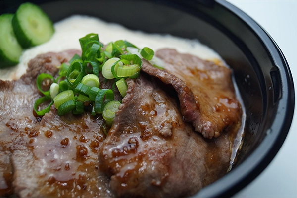 - 群⾺県産の⼤和芋を使⽤した⽜たん⻨とろ丼!塩麴漬けの⽜たんとの相性抜群です!!