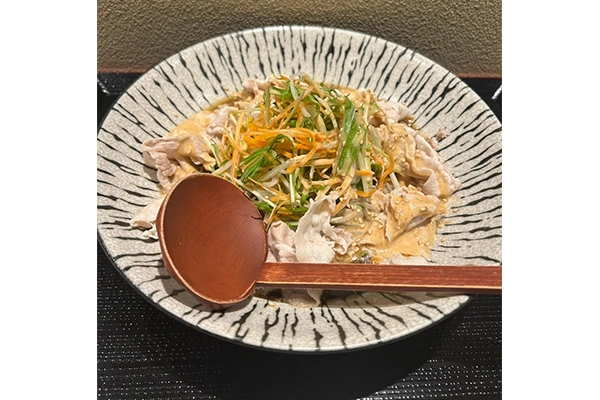 - 蕎麦屋の拘りの出汁に豚しゃぶと香味野菜を添え、特製のゴマダレが相性抜群。