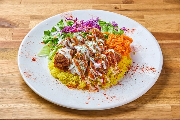- ニューヨークの屋台フードとして知られるチキンオーバーライスをはじめ各種オーバーライスをお届けします。