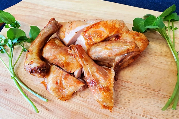 - 国産ハーブ鶏使用のローストチキン。余分な油を落とし、ヘルシーかつジューシーな仕上がり。